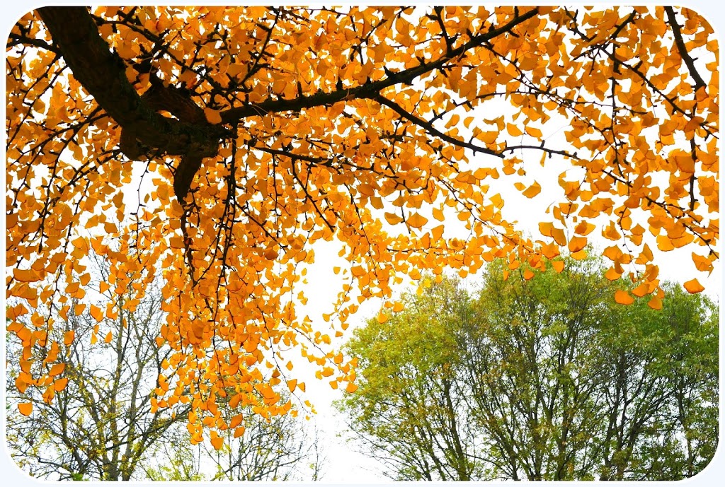 Dans les environs de notre petit bicoque qui accueillent nos balades rituelles, se dresse un beau ginkgo dont les feuilles brillent, ces jours-ci, d’un jaune merveilleux et lumineux.
