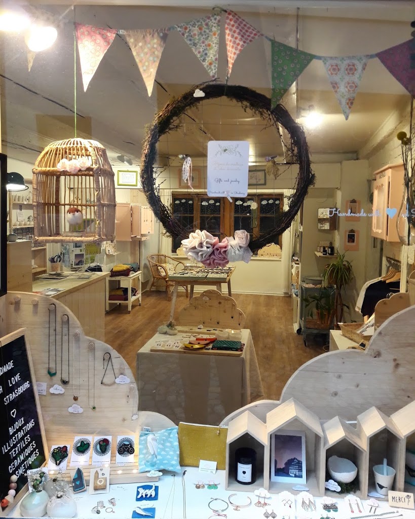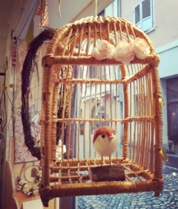 Pour la vitrine j’ai customisé une jolie cage en osier, installé une guirlande de fanions et  suspendu des craspedias et du gypsophile séchés dans une fiole en verre. Une décoration naturelle et épurée qui convient bien à l’atmosphère cocoonesque de la boutique ♡