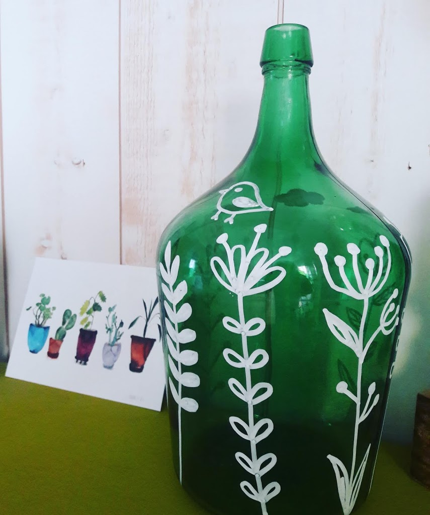 J’ai pris ma Dame Jeanne chinée au Portugal ( mes souvenirs de voyage sont chinés ou achetés des des petits créateurs locaux ♡) et dégainé mon feutre-craie ( vous pouvez en trouver dans les magasins de loisirs créatifs par exemple) puis j’ai simplement dessiné des motifs floraux printaniers sur la bonbonne! Je trouve que le résultat est très chouette!