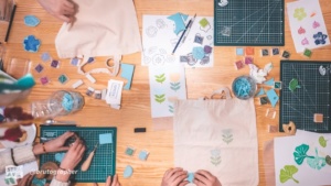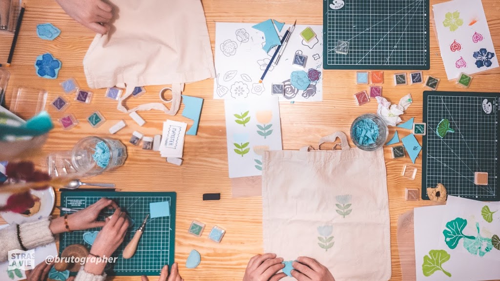 Pendant deux heures, en petit groupe et guidé(e)s par une artiste strasbourgeoise les participant(e)s retrouvent la joie du fait main.